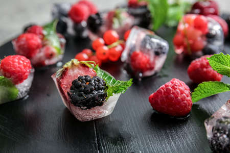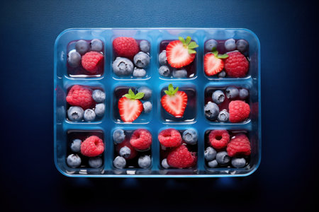 Frozen ice cubes with organic berries raspberry, strawberry, blueberry in ice cube tray close up