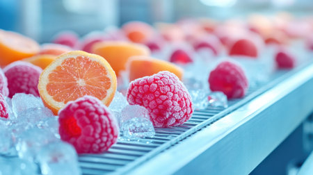 Fresh fruits and berries including raspberries and oranges are beautifully displayed on ice. This vibrant image captures the essence of summer and healthy eating.
