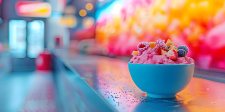 Colorful Smoothie Bliss: Vibrant Bowl in a Fast Food Environment. Concept Smoothie Making Process, Healthy Ingredients, Fresh Fruit, DIY Smoothie Bowl