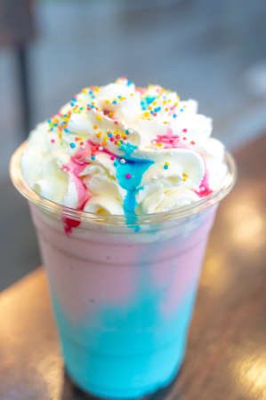 cold lollipop milkshake drink with whip cream and colorful sugar balls