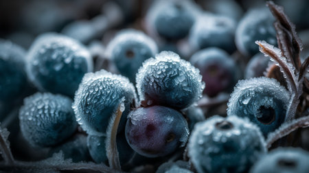 Blackthorn sloe frost sparkle macro on graphite felt creating winter minimal drama ideal for editorial nature food stories and serene seasonal backdrops