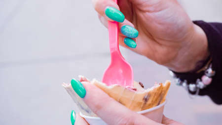 Close up of teen girl with paper cup with mango yellow sorbet ice cream on sunny summer day