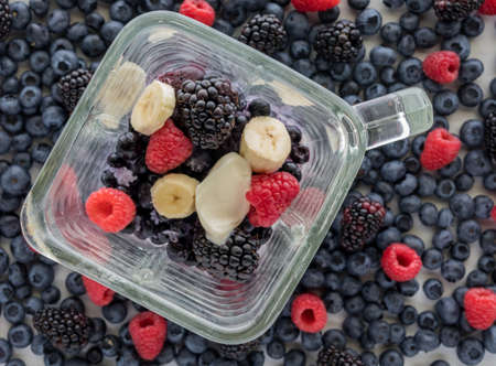 Berries and assorted ingredients in a blender ready to be blended into a smoothie.