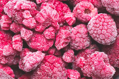 Frozen raspberries in white plate on green background. Frozen ripe raspberries with ice cubes. Whole raw frozen berries.