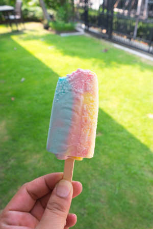 Colorful sticky popsicle residue on ice showcasing summer treats and refreshment moments