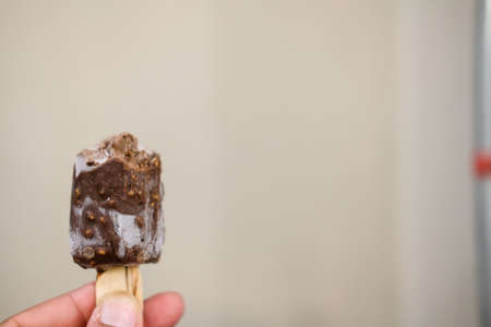 Ice cream bar vanilla covered with chocolate and nut in hand