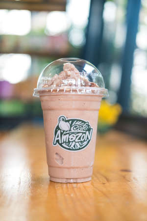 Bangkok, Thailand - December 20, 2021 : The new menu Caramel Mocha Frappe with KitKat has priced 70 baths at all Cafe Amazon branches. Cafe Amazon beverage shop at PTT oil station.