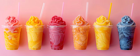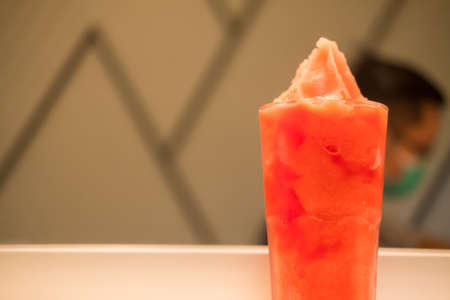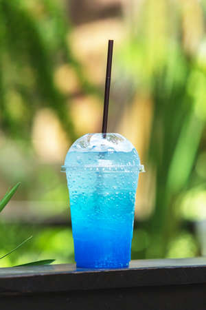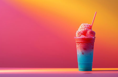 Colorful fruity slushie drink in plastic cup. Summer tropical frozen juice cocktail Slush