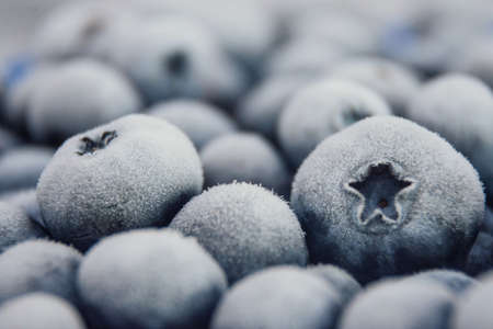 a lot of frozen blueberries covered with hoarfrost, close-up
