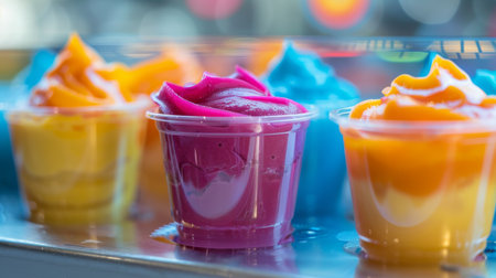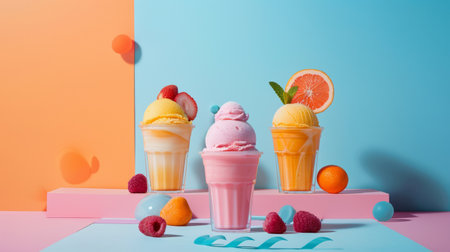 Three colorful ice cream cups with fresh fruits, set against a vibrant and playful background. Ideal for summer themes, desserts, and treats.