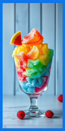 Colorful rainbow shaved ice dessert served in a tall glass with vibrant fruit garnishes