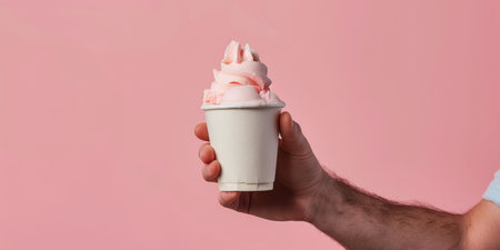 Hand holding a cup of pink ice cream with whipped cream on a pink background.