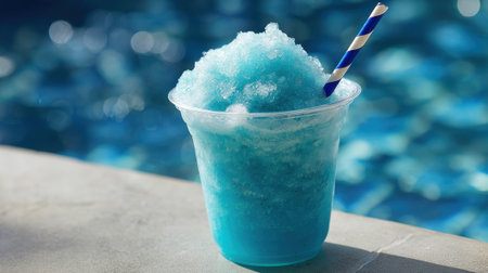 Bright blue slushy sits next to a sparkling pool perfect for cooling off on a hot day.