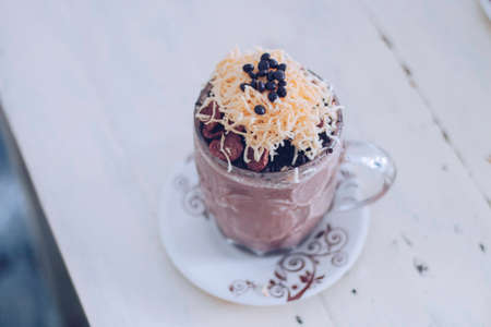 Chocolate Milkshake with chocolate cereals, cheese, and Choco chips in the big clear glass cup. Selective focus close-up on top of it and blurry background.
