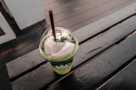 AI Generated. A layered dessert drink with whipped cream and yellow topping