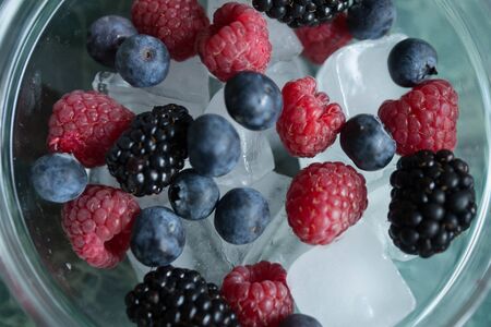 Image of raspberries, blackberries and blueberries on ice in a glass bowl