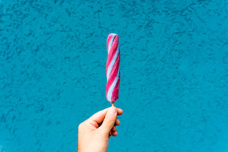 Ice cream cone in hand on minimal color background isolated. Summer, food, sweets, ice cream concept.