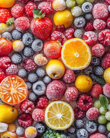 A colorful array of fresh frozen fruits creates a beautiful background filled with a variety of vibrant textures and colors. This composition showcases an abundance of strawberries, raspberries, oranges, and other delightful fruits, evoking a sense of freshness and natural beauty.