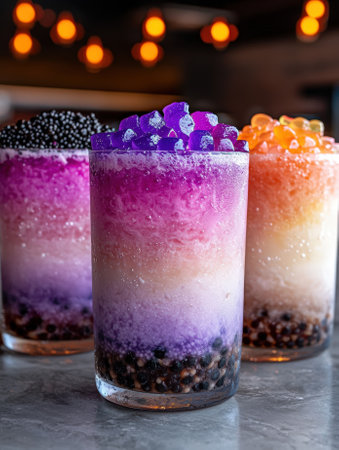 Colorful boba drinks with tapioca pearls and jelly toppings.