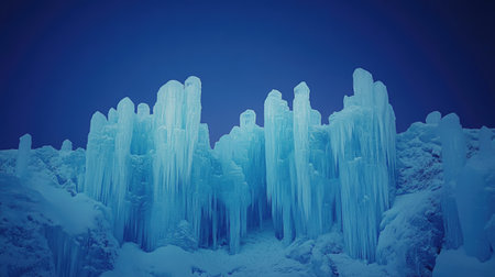 Breathtaking image of frozen ice formations reaching towards the dark blue sky, creating a stunning contrast. Captures the beauty of winter's chill.