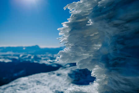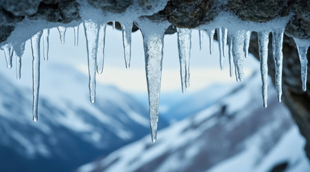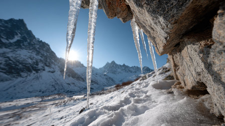 Stunning close-up view of icicles dangling from a rocky surface, with a breathtaking snowy mountain landscape and soft sunlight illuminating the scene.