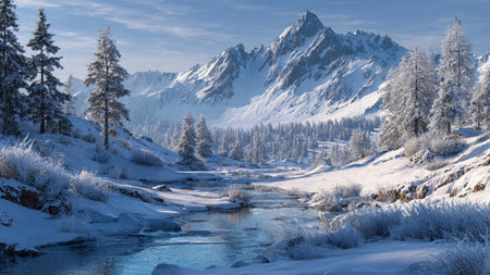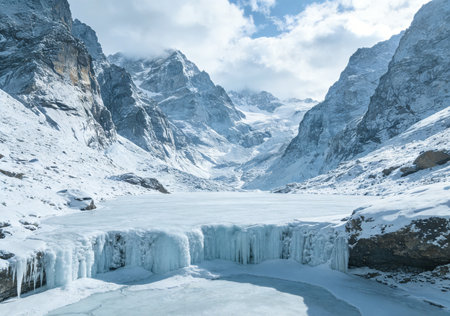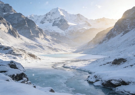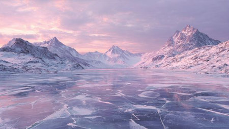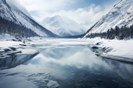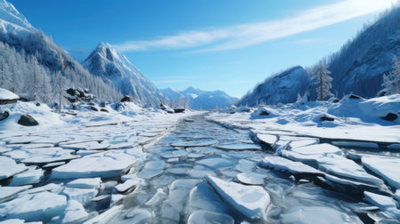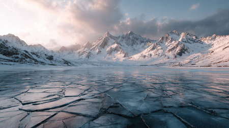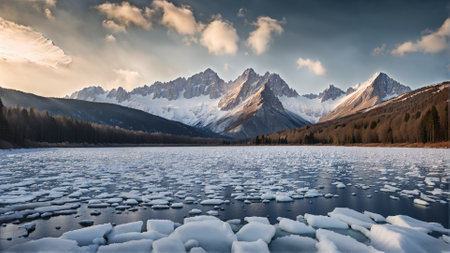 An AI generated illustration of A stunning tranquil scene featuring a lake filled with ice surrounded by towering snow-capped mountains