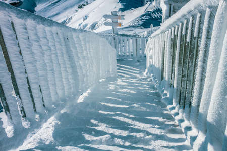 macro shot of a wooden fence covered with ice crystals due to the hoarfrost in winter