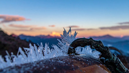 As the sun dips below the distant mountain peaks, its last warm rays catch the edges of delicate ice crystals.