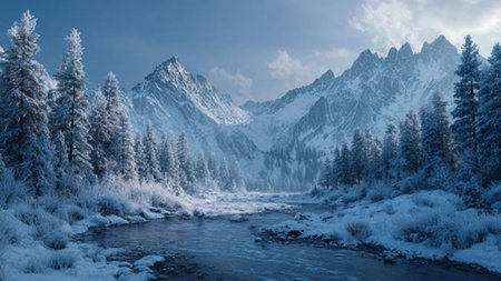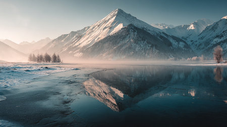Serene Winter Reflection: Snow-Capped Mountains Mirroring on Frozen Lake at Dawn