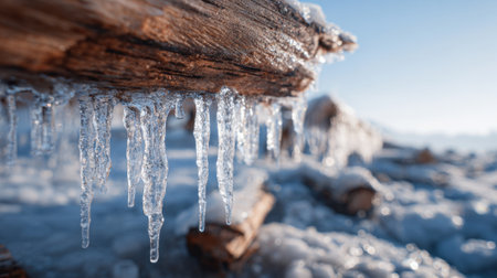 Long icicles hang from the edge of weathered wooden logs, capturing sunlight as they reflect shimmering hues. The surrounding area is blanketed in snow, enhancing the winter scenery.
