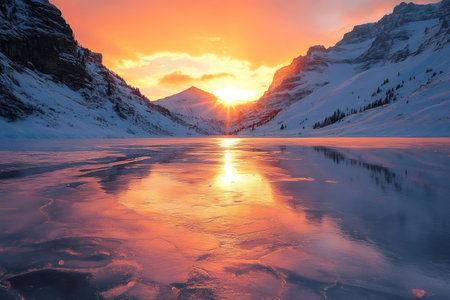 Stunning sunrise paints the sky with vibrant hues, reflecting off a frozen lake nestled amidst snow-capped mountains