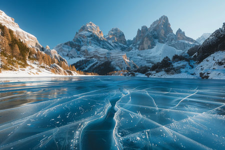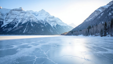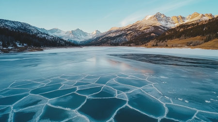 A picturesque winter scene featuring a frozen lake with cracks on the surface, surrounded by snow-covered mountains under a clear blue sky.