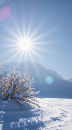 Bright sun shining over a snowy landscape with mountains in the background. A bush covered in frost is visible in foreground