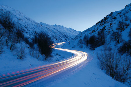Twilight serenity long exposure capture of an alpine road amidst snowy mountains and car lights