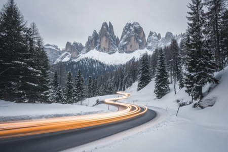 Winter road to the dolomites long exposure car trails amidst snowy peaks and trees