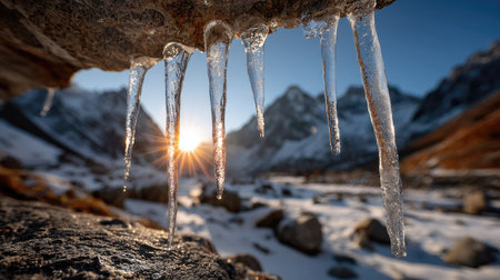 Beautiful icicles hang from a rugged rock formation, capturing the warm glow of a sunset over a majestic mountain landscape, illustrating nature's beauty.