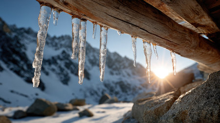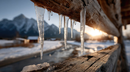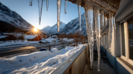 A captivating winter scene featuring shimmering icicles hanging from a roof. The majestic mountains and warm sunset create a tranquil atmosphere, making it perfect for nature lovers and winter enthusiasts.