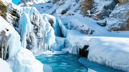 A stunning frozen waterfall cascades down icy cliffs in a serene winter landscape. Vibrant blue water contrasts with white snow, creating a tranquil scene.