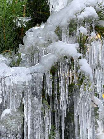Icicles on a decorated Christmas tree with cones and garlands. Branches completely covered with ice.