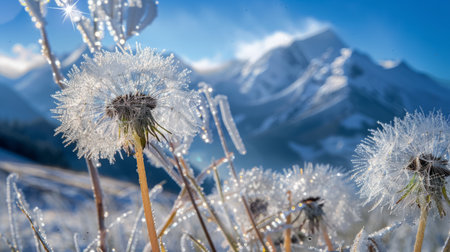 dew on dandelion seeds with snowy mountains in the background and a bright blue sky generative ai