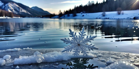 Snowflake on the surface of the lake in the mountains. Winter landscape