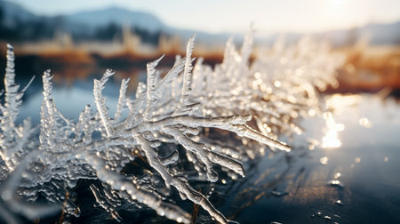 Delicate ice spikes catch sunlight as they emerge from a frozen lake in a serene winter landscape.
