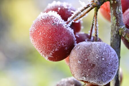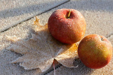 the first frosts in late autumn. the apples and maple leaf were covered with frost. autumn background, top view