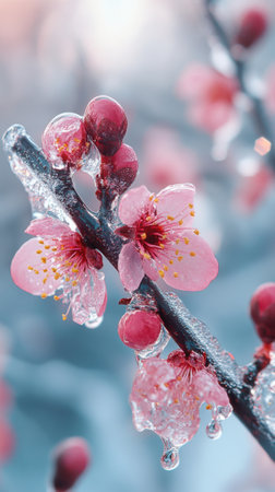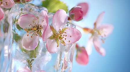 A striking close-up image of pink cherry blossom flowers encased in ice, beautifully contrasting with a soft blue background, showcasing nature's elegance.