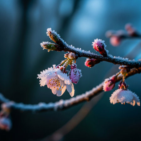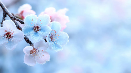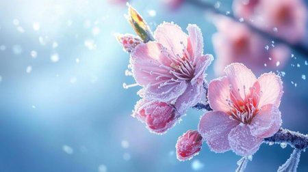 This beautiful close-up image showcases frosted pink cherry blossoms on a branch against a soft blue background. Snowflakes gently fall, adding a serene feel.
