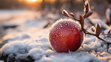 A close-up photograph of a frosty red apple on snow-covered ground at sunset, evoking a serene and wintery atmosphere.