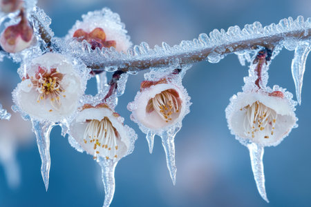 A close-up of blossoming plum flowers on the branches, covered in frost against a soft blue background. The delicate petals and fresh green leaves contrast with the cold weather, creating an elegant winter scene. --ar 3:2 --v 6.1 Job ID: 49c18621-5f19-431d-a5a1-e19933e59323
