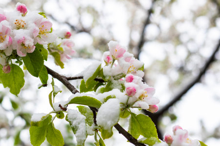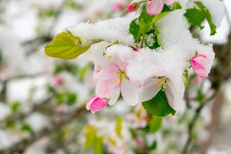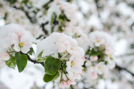 Apple tree blossoms covered in snow during unexpected snowfall in spring. Blooming flowers freezing under white snow in the garden.