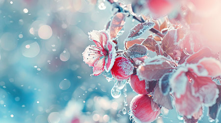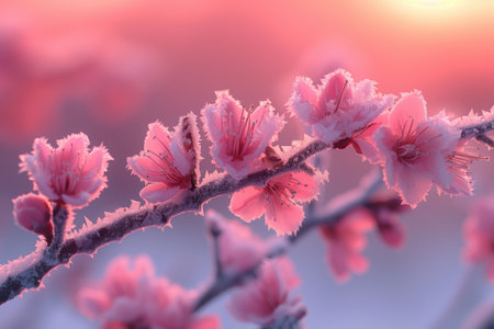 A close up of a branch of pink flowers with frost on them. Concept of serenity and tranquility, as the delicate flowers are surrounded by a peaceful, snowy landscape