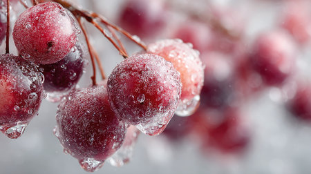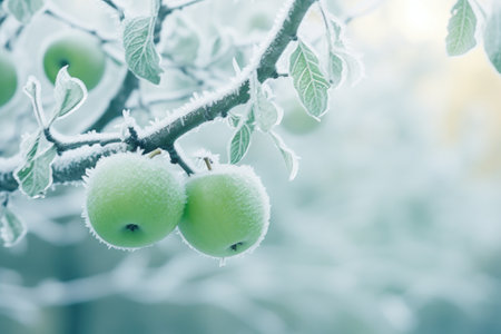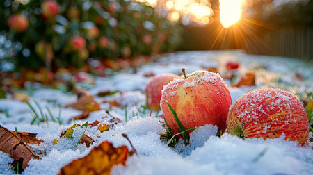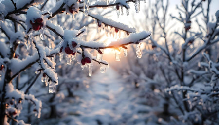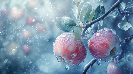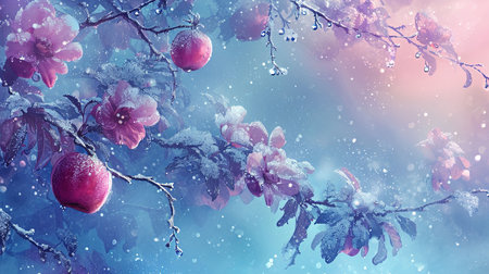 A serene winter scene featuring red apples adorned with frost, hanging from trees. The warm light creates a magical atmosphere, perfect for festive themes.